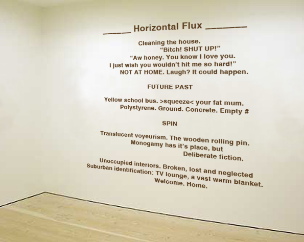 Inspired by the work of experimental writer and artist Kathy Acker, Borrowed Word is a series of poems written using text appropriated from a range of popular media sources. “Horizontal Flux” is a motion graphics piece created using a borrowed word beat poem.