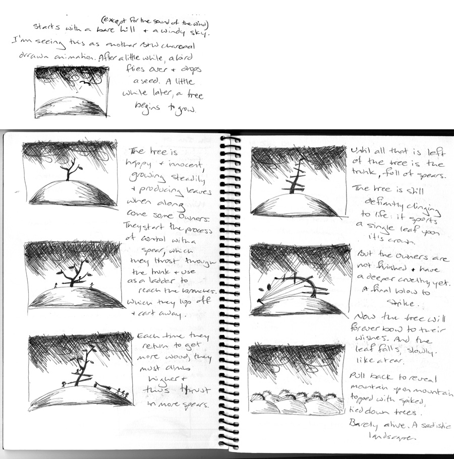 Pain Trees is a short, hand-drawn animated film representing oppression and the malicious destruction of innocence. Silent, except for the sound of the wind, which is a constant soundtrack throughout. Inspired by the artworks of William Kentridge.