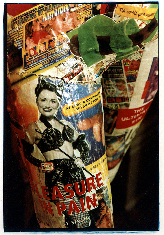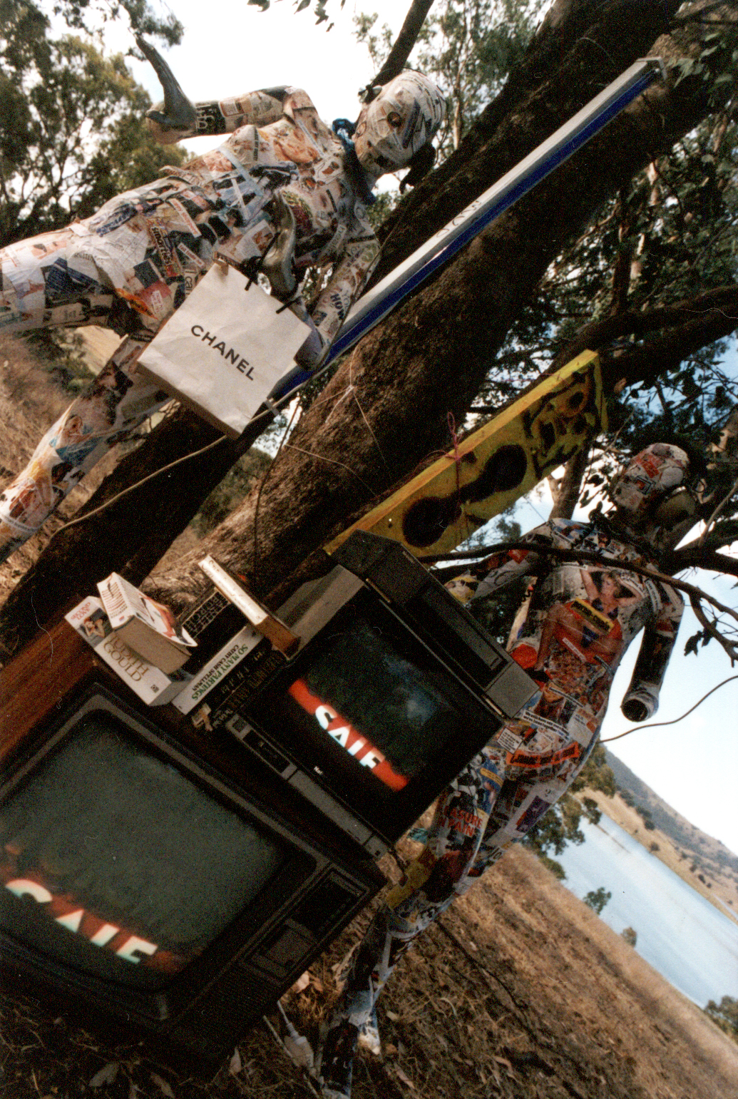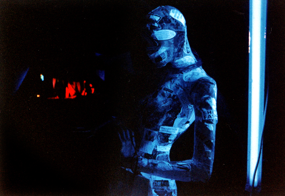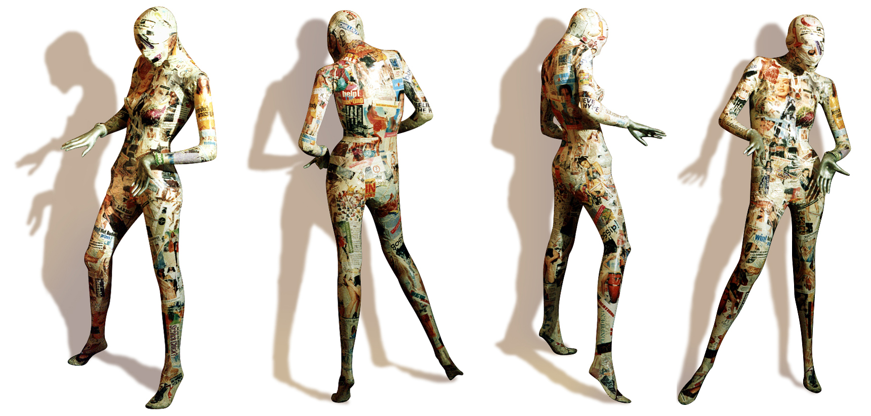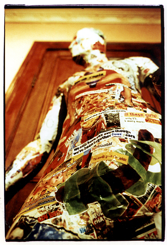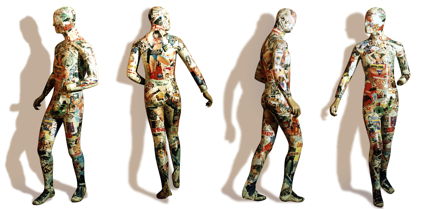 The installation was composed of two mannequins, one male and one female, covered in paper-mâchéd skin made from gender specific, targeted media, designed to visually highlight the stereotypes that are generated and reinforced through this media. The mannequins wore headphones and were chained to a stack of TVs playing looped advertising content and recordings of endless channel flicking.