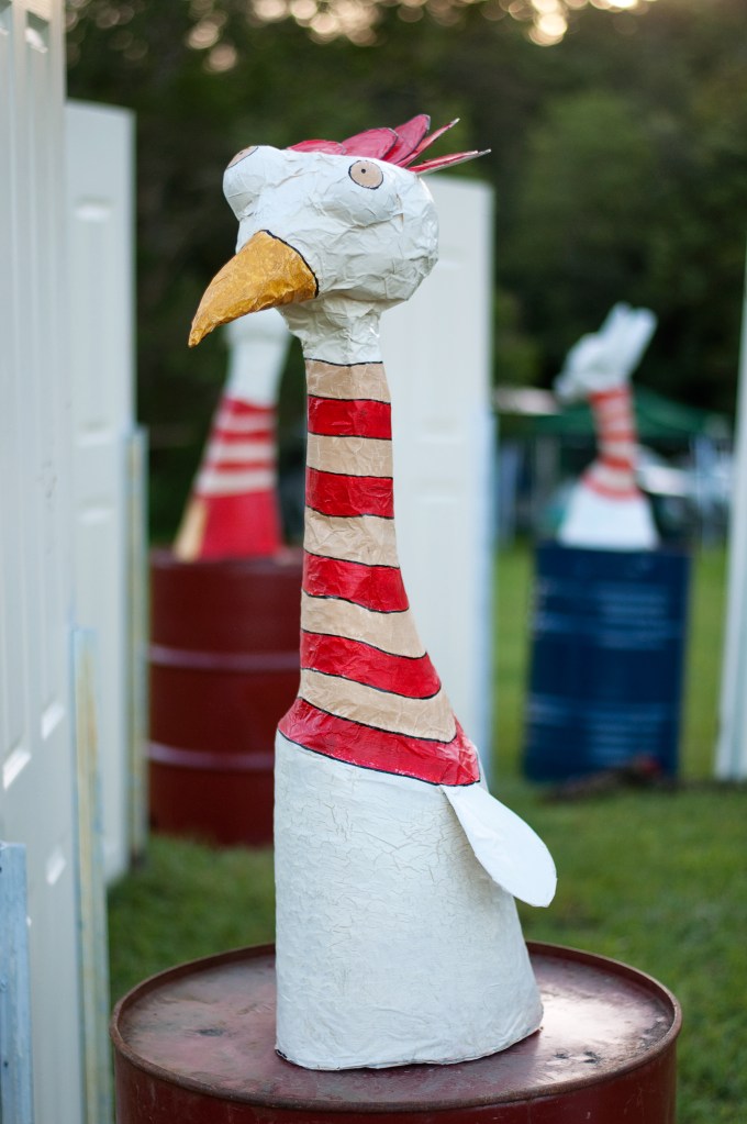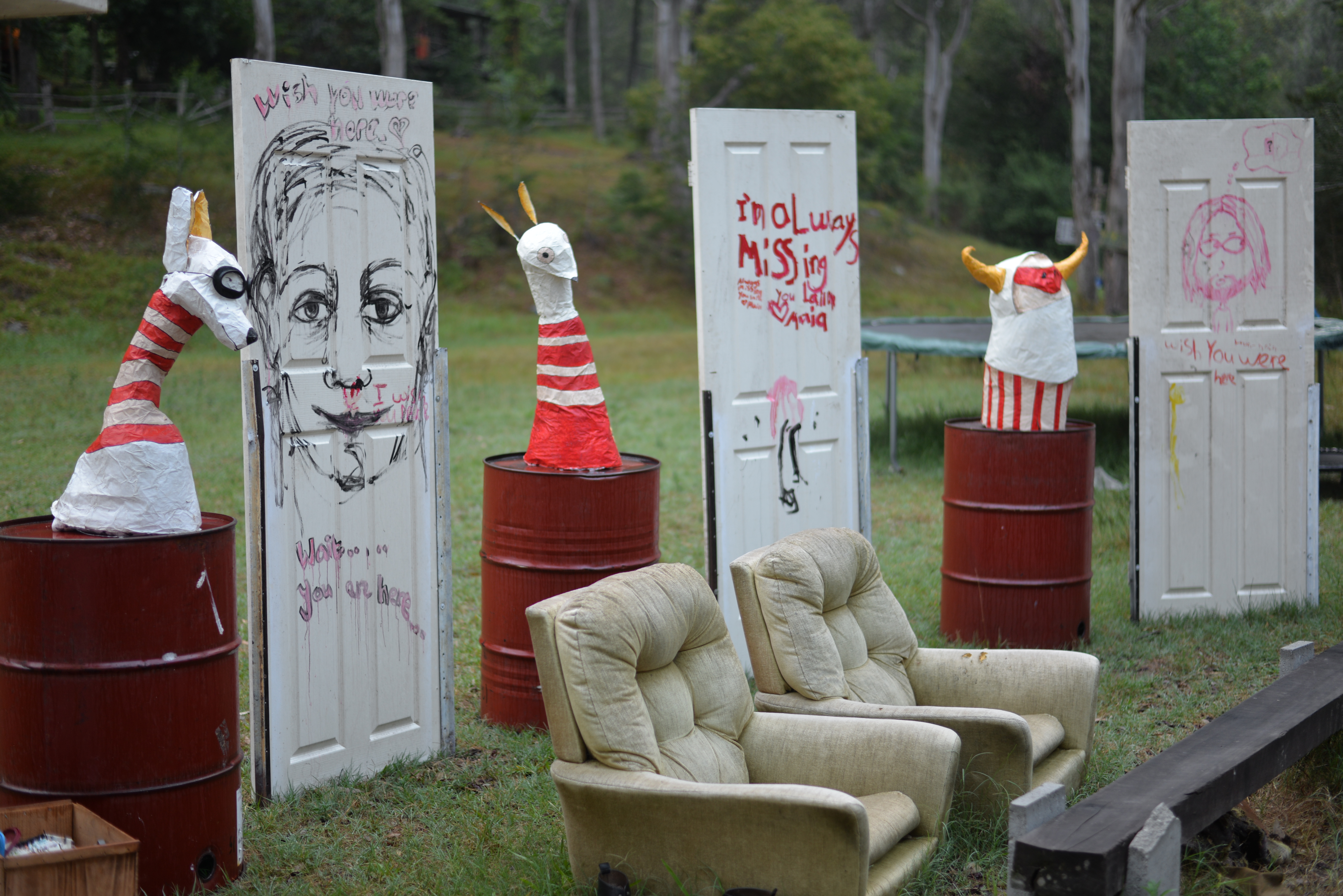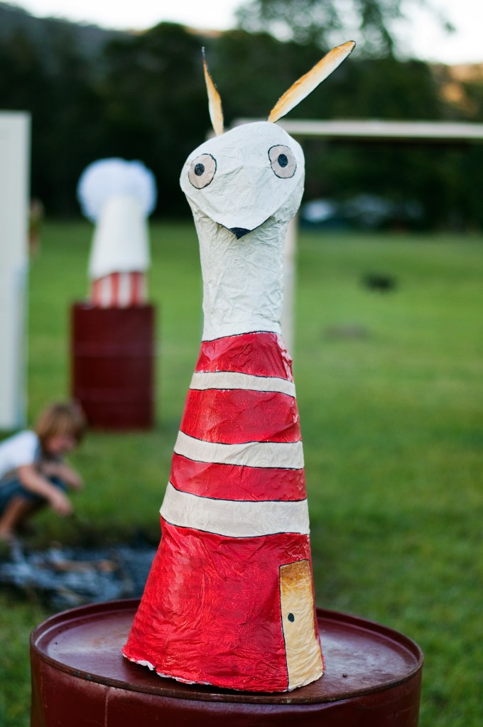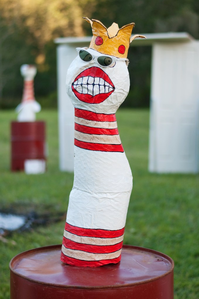 Circus prop characters were the first set of guardians created for the Wild Temple of Yam in response to the theme of Cirque du Yam. This set of 12 character sculptures took about 9 months to complete and embody representations of the different human archetypes that make up social structures and form community. They average 1m in height and are made from chicken wire and papier-mâché, painted to look like aging circus props.