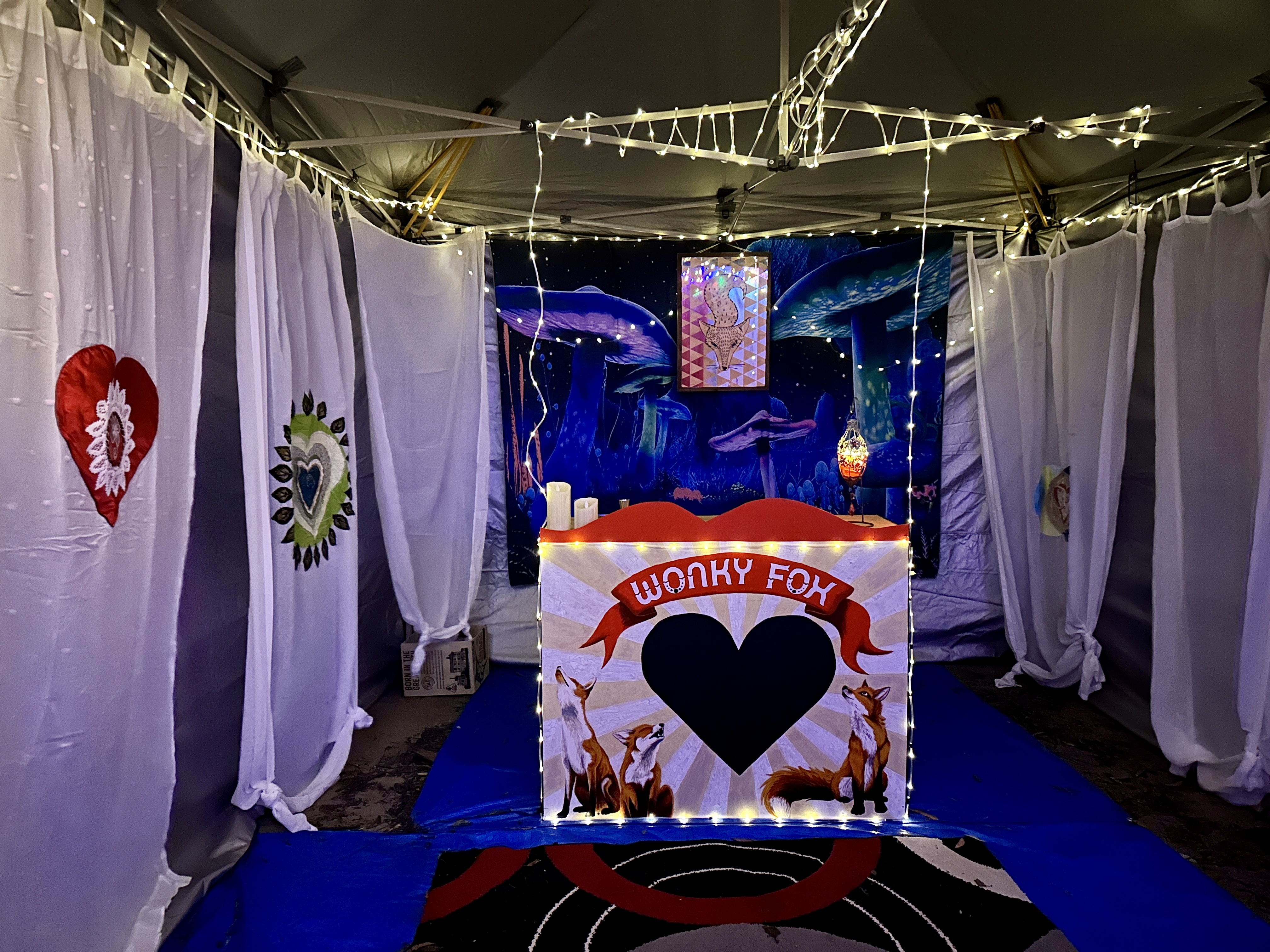 The camp experiential setup included our popup Globe theatre entrance facade, the Wonky Fox bar, karaoke stage set, our fake fire pit, the Jolly Roger flying on the flag pole, a fabulous trippy secret tunnel exit leading to a fairy lit mush love garden and our tuxedo clad letterbox!