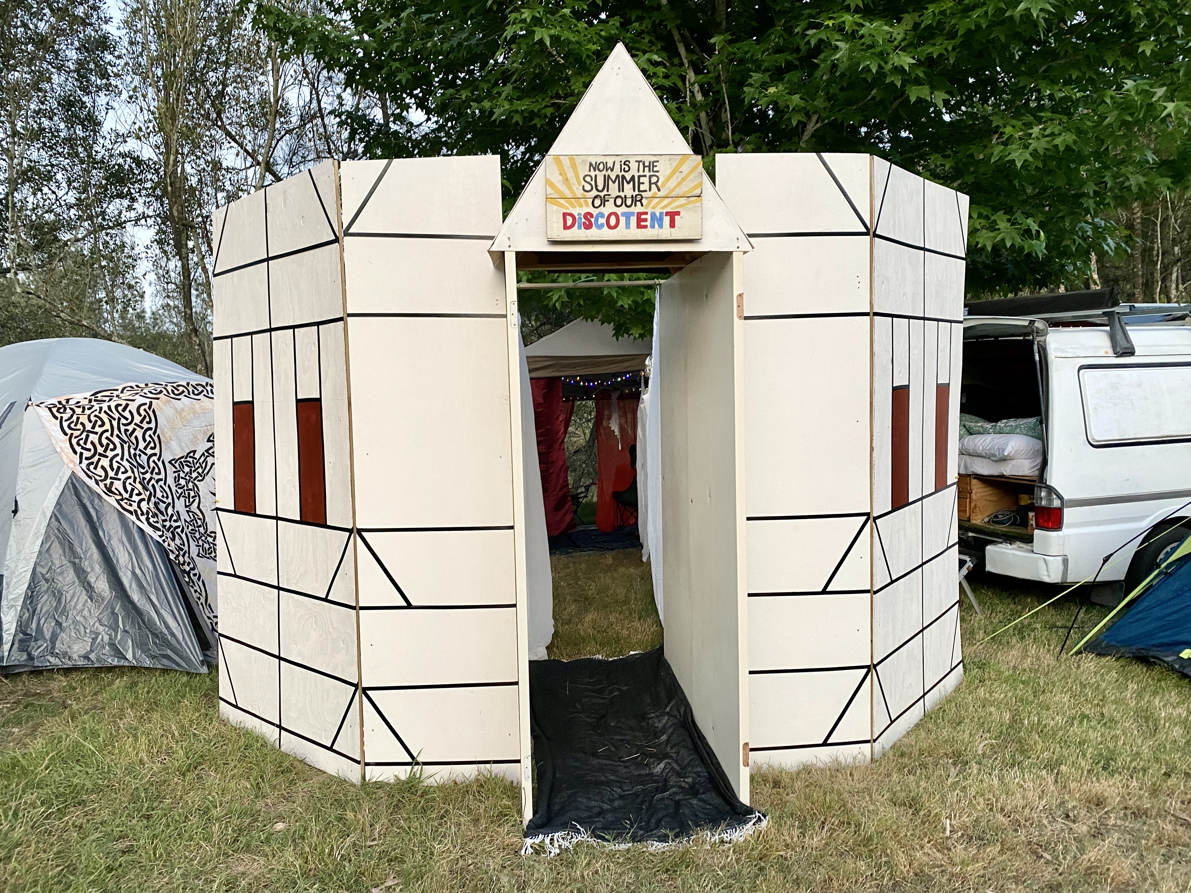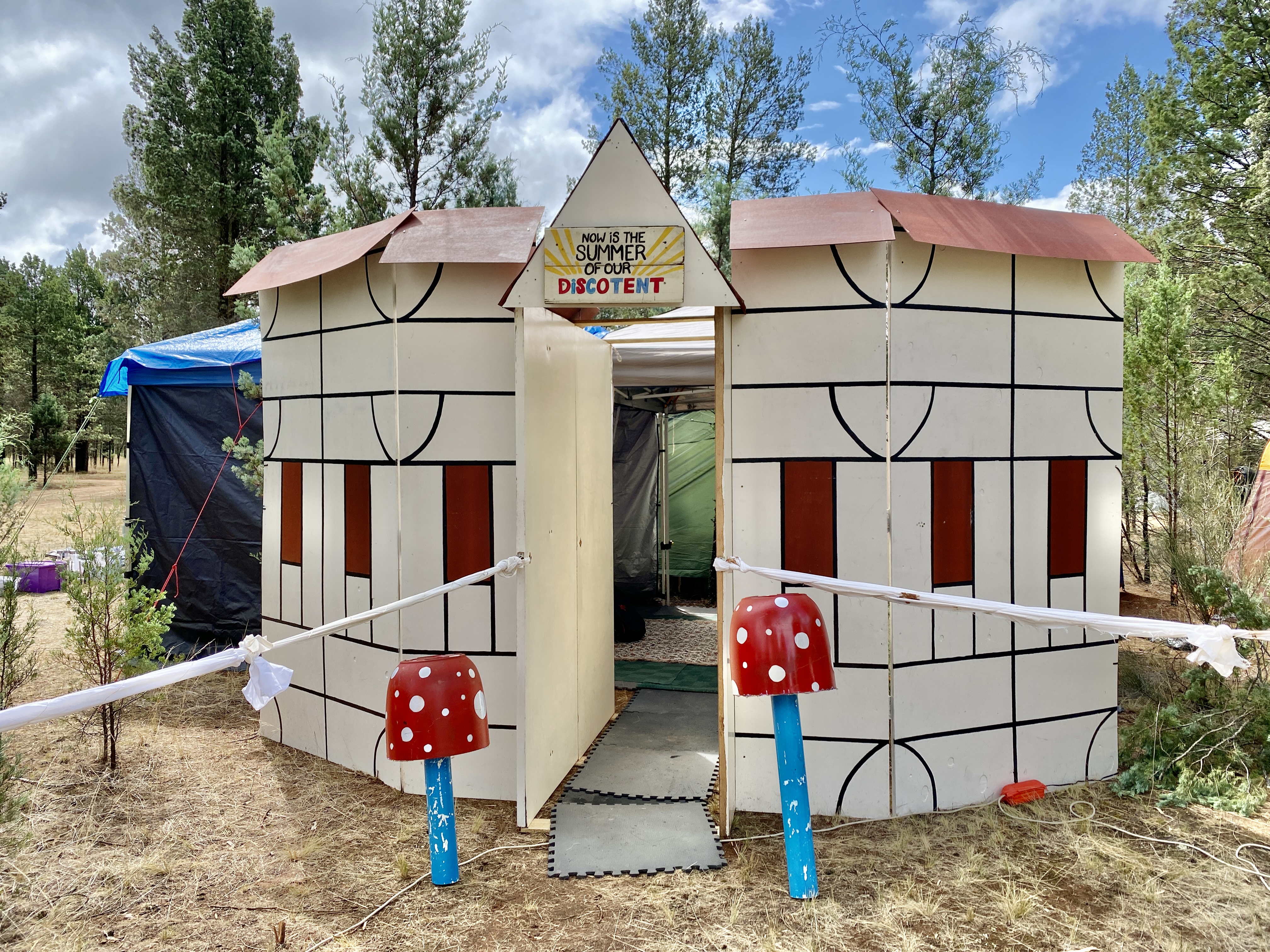 Originally designed for Wild Yam’s “A Midsummer Night’s Yam” in 2022, the Globe theatre facade is often the entrance to the Miss Peaches theme camp. With the help of Will Shakespeare (aka Legs 11:11), the space transforms into a Shakesperean-inspired night club where events such as Bogan Shakespeare and Miss Peaches Masquerade Ball “Now is the Summer of our DiscoTent” take place.