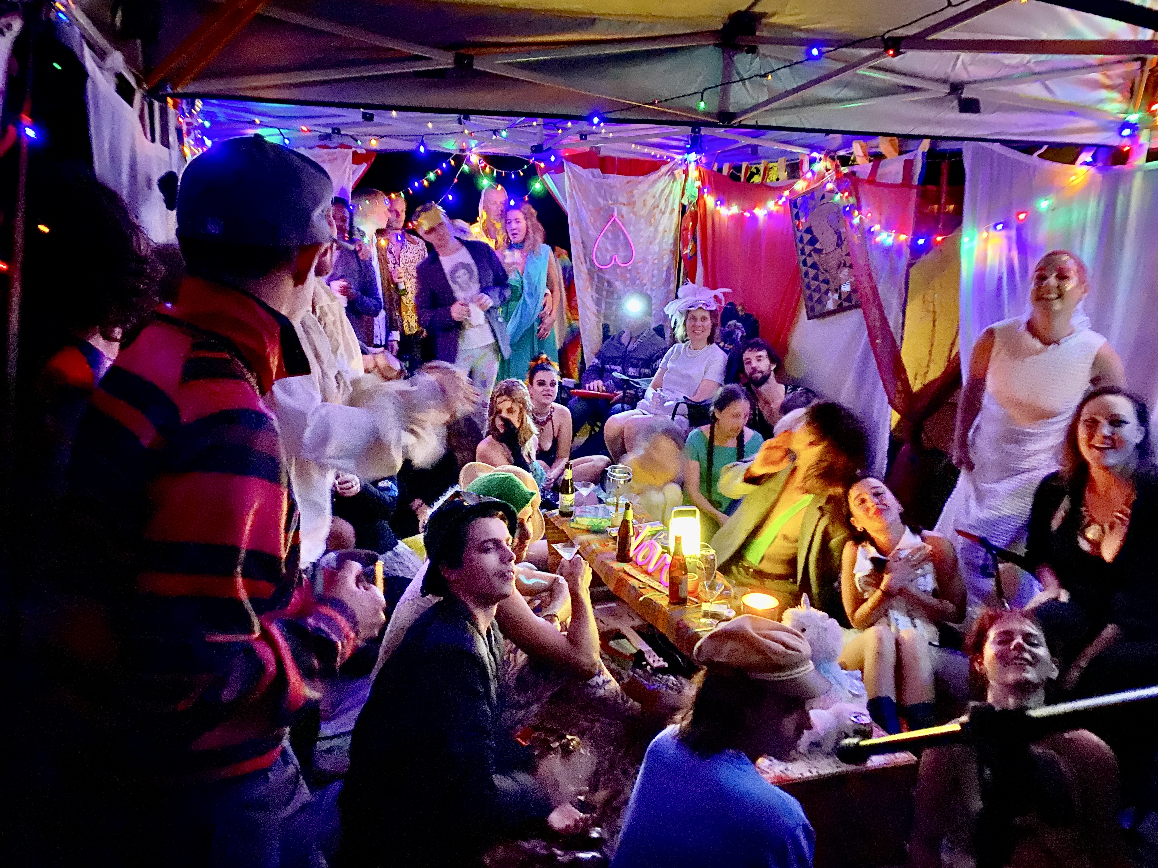 Every year brings new worlds, new themes and new chances to unleash your inner performer: music jams, improv sessions, fantasy creature meet-and-greets, burlesque, rock shows, silent disco challenges, jousting tournaments, parades of absurdity, wild raves, chaotic art sessions, spiritual discussions, high-camp theatre and the beloved Miss Peaches Speakeasy — where anything can happen and usually does.