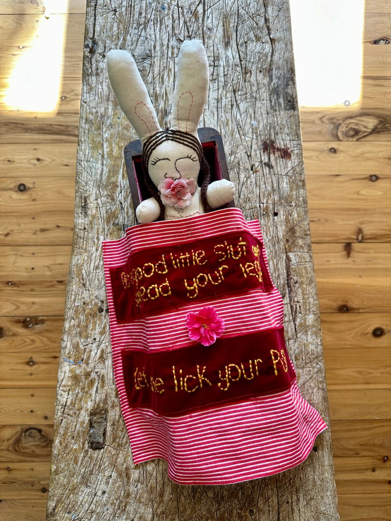 The red velvet lining of the box frames her as precious—not as a commodity, but as something she has the right to value, protect, adorn and offer on her own terms. The embroidered quilt and coffin-like frame reference the structured, traditional boundaries that have historically shaped and restricted women’s sexuality. But here, embroidery—often coded as a domestic craft—becomes an artform reclaimed. What was once the enforced skill of the “good daughter” becomes the cultural inheritance of a woman who will define “home,” “bedroom,” and “womanhood” for herself.