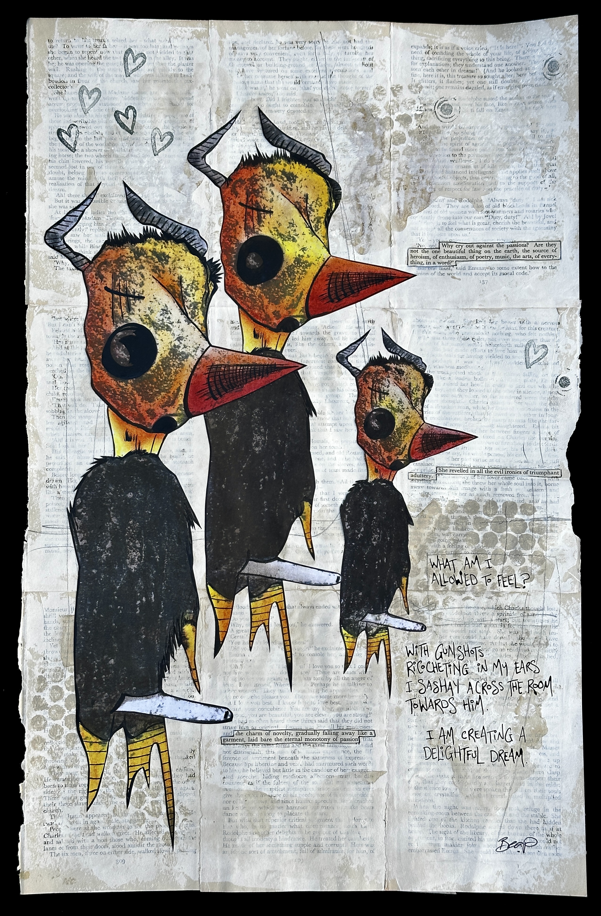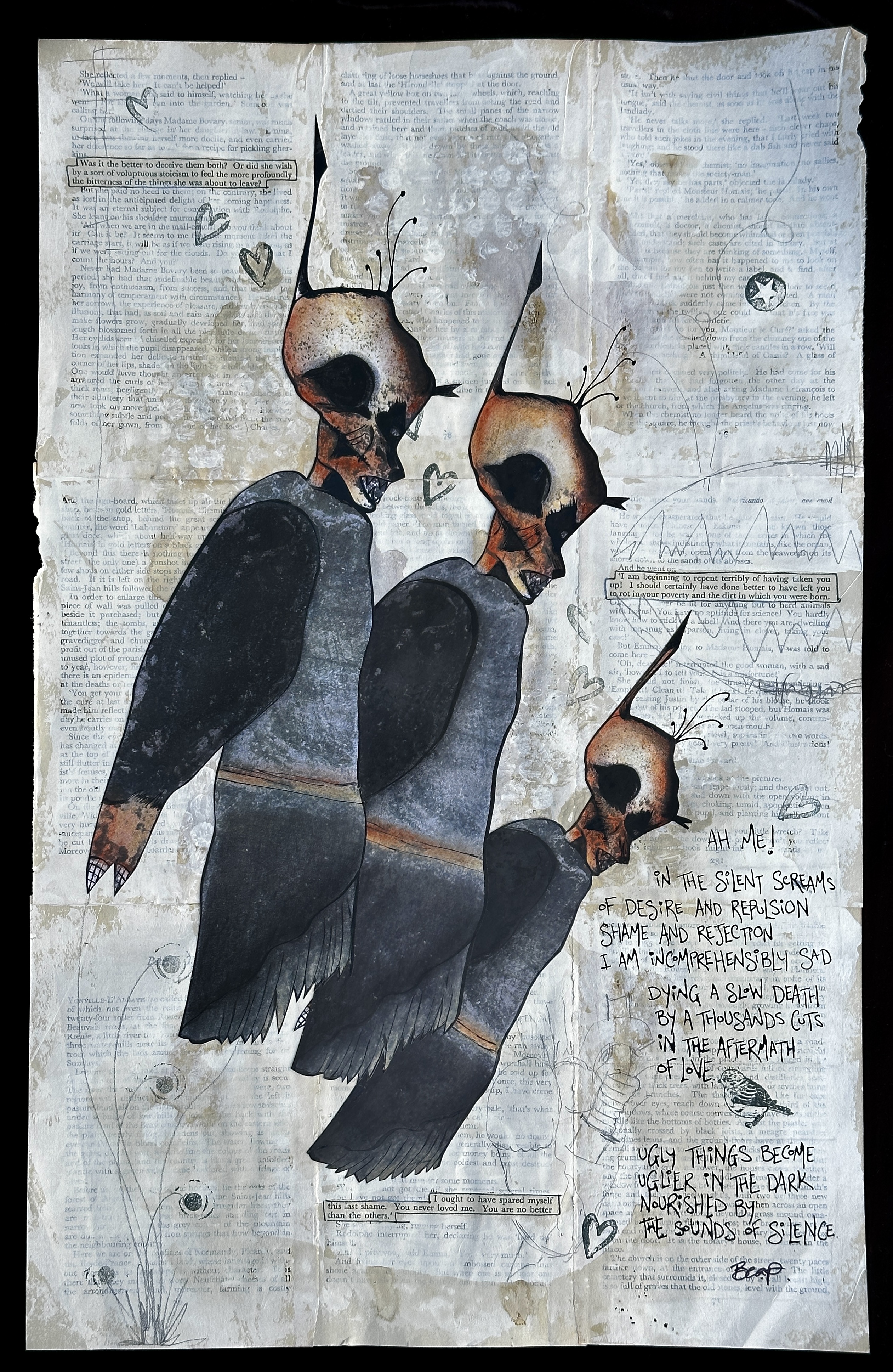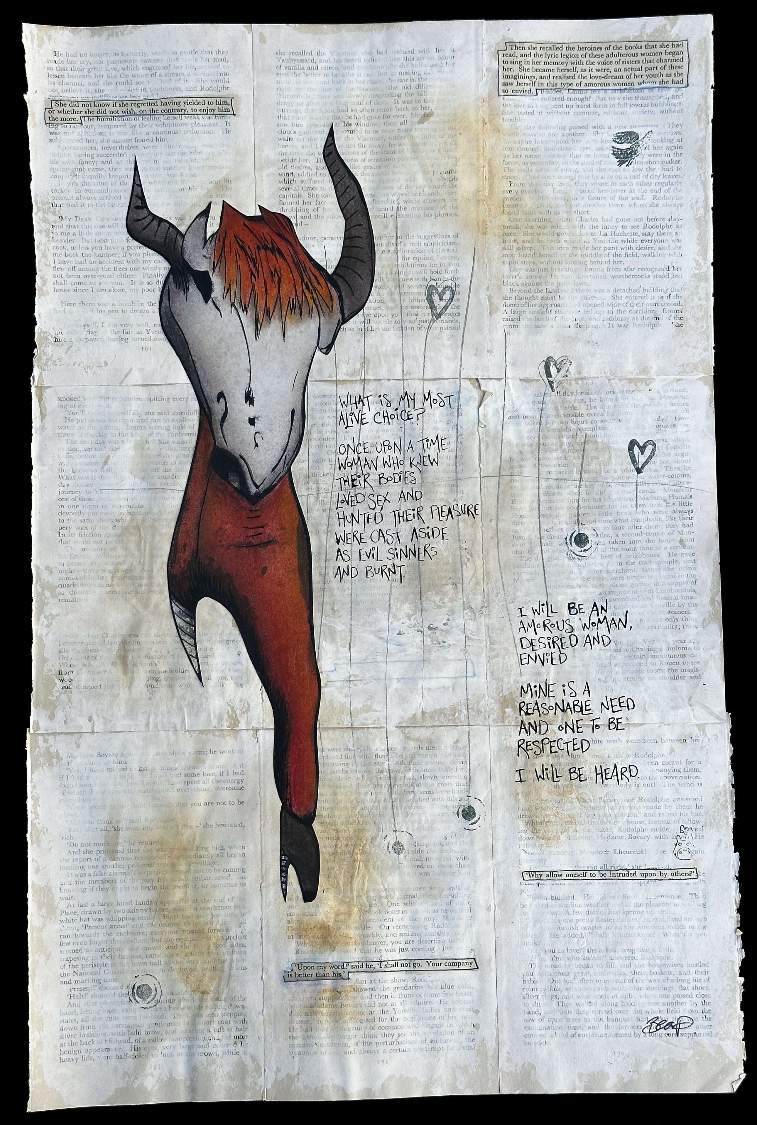 The Devil Dances in Me is a layered narrative artwork built upon the bones of another story. Using pages from Madame Bovary as its substrate, the work rewrites and reclaims a 19th-century tale of constraint, longing, and punishment. Onto this foundation, a contemporary parallel unfolds: a modern woman confronting the inherited scripts of abuse, internalised misogyny, and the distortions they carve into body, gender, and identity.
