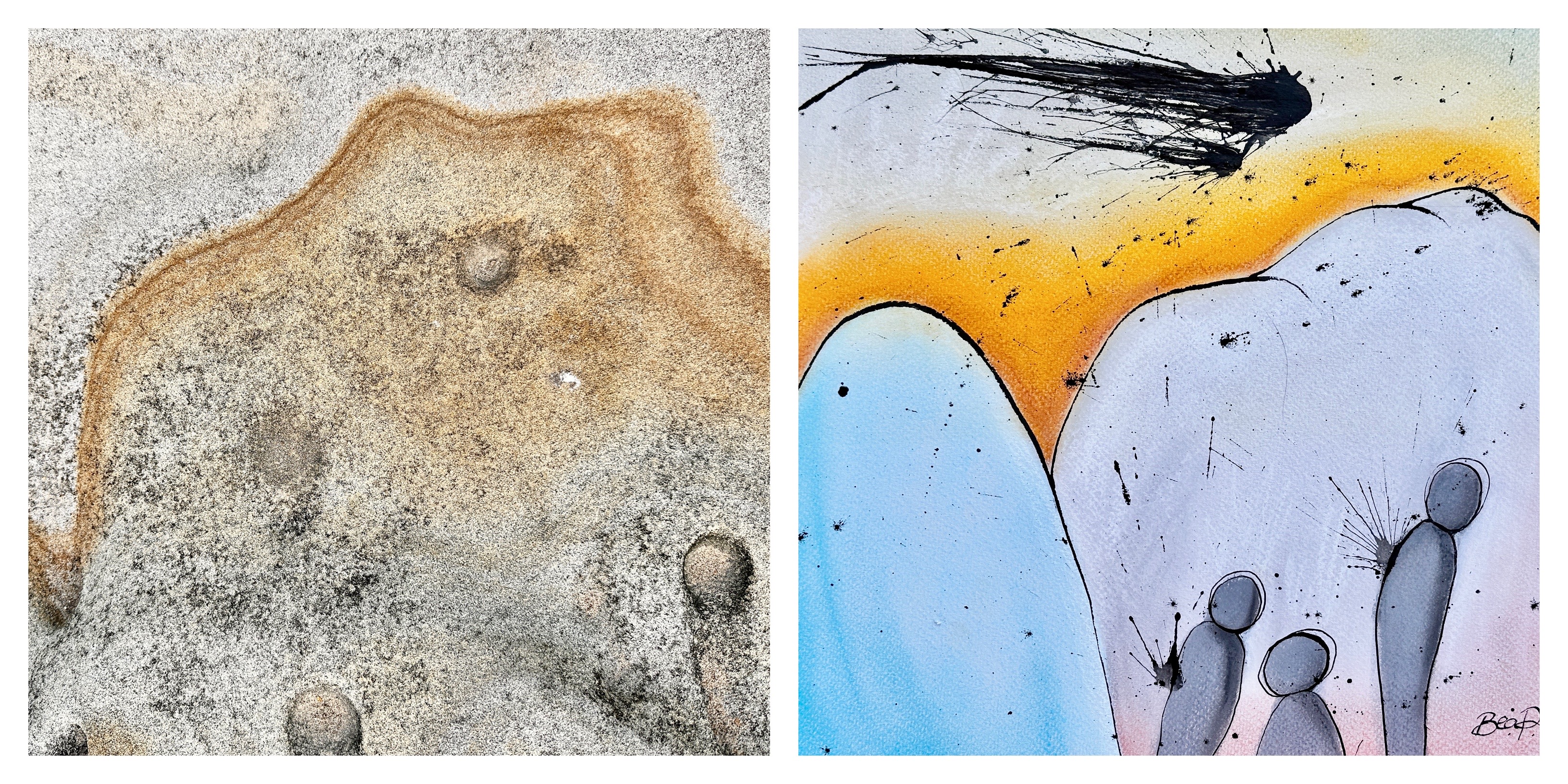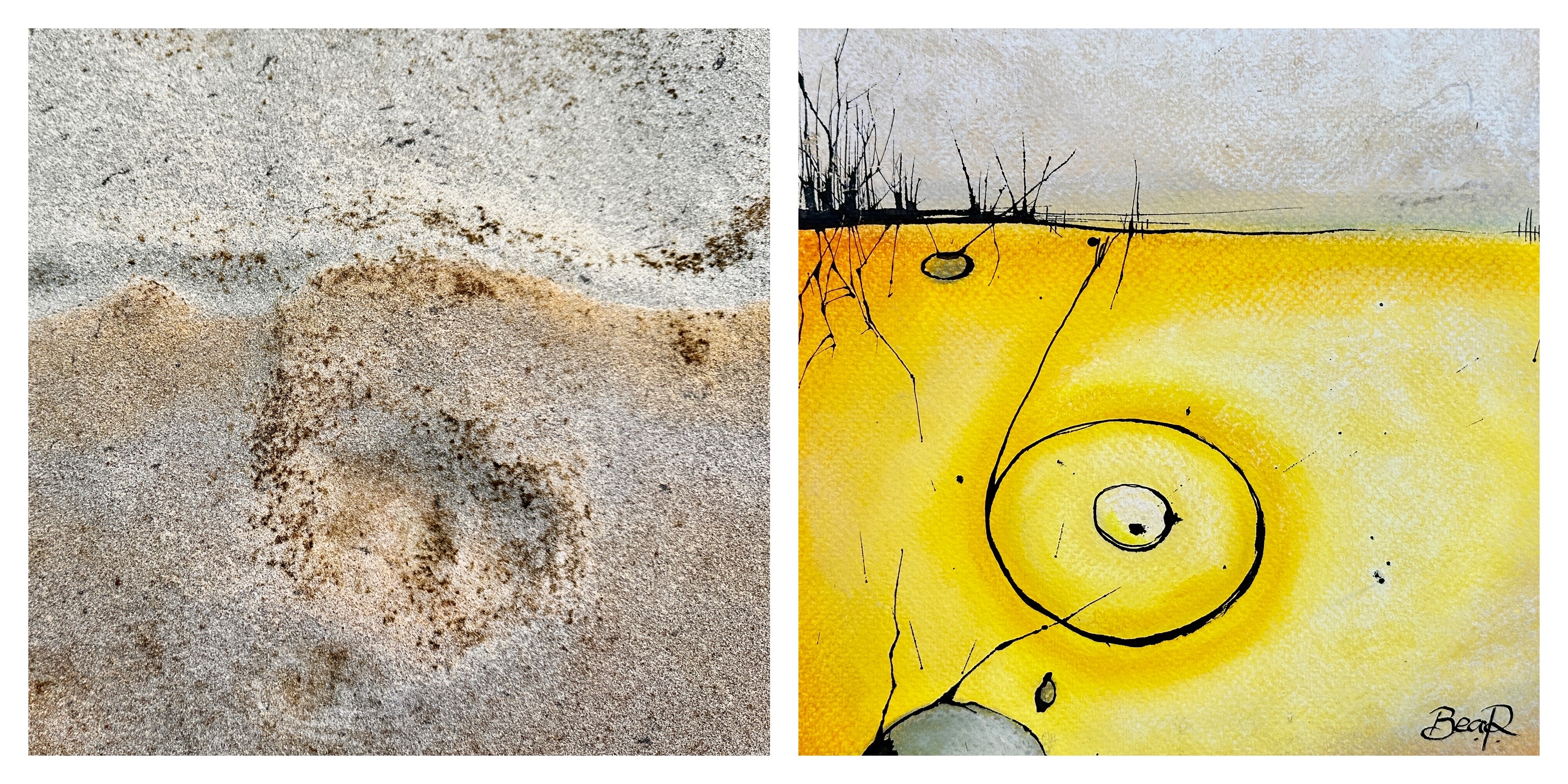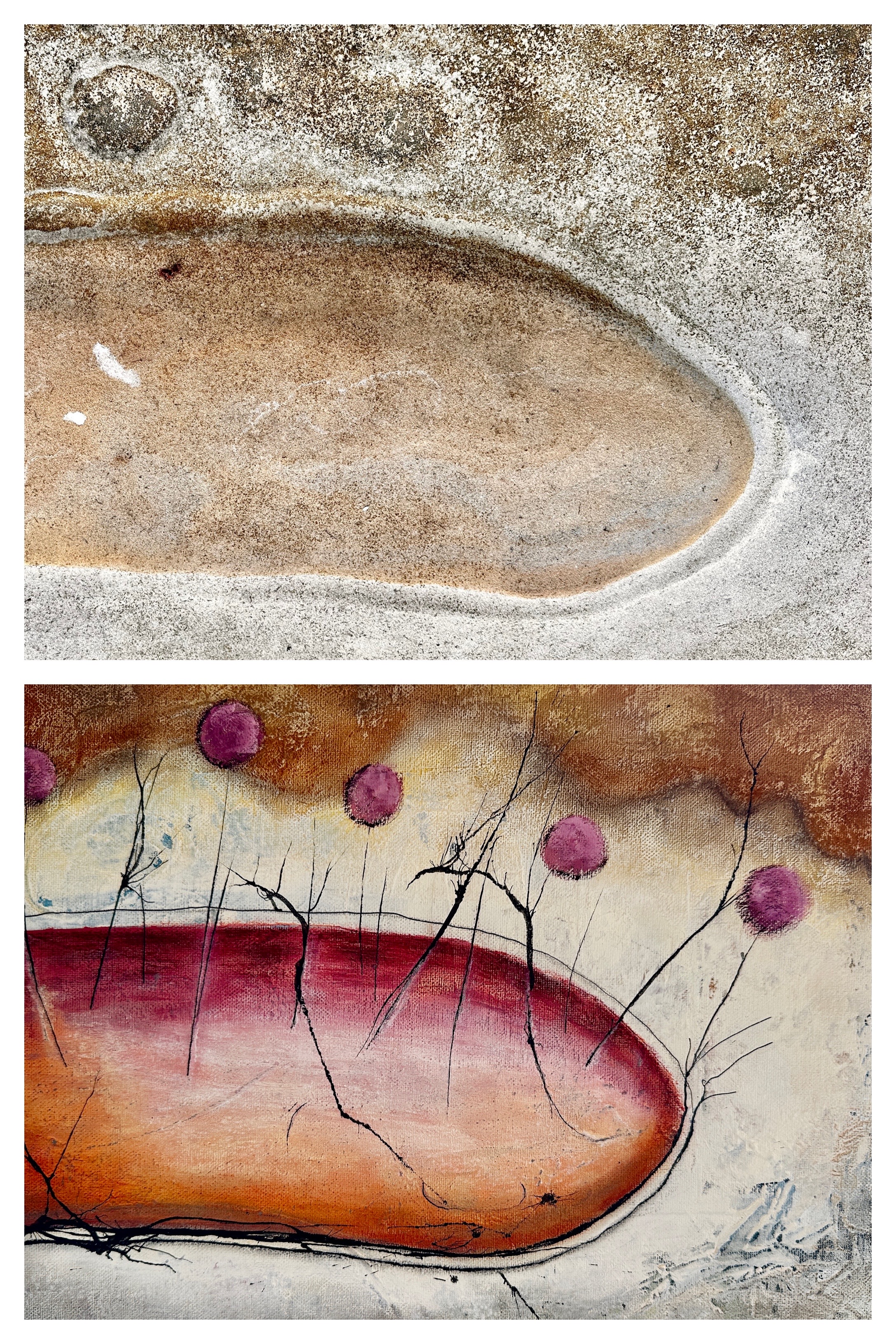Rendered in acrylic, pastel, ink, and pen on either canvas or paper, each piece is a meditative vision and an emotional landscape, depicting places of solace, restoration, and inner balance. What starts as a close-up of the earth becomes a place of inner reflection: soft washes echo the movement of water, intricate lines recall sediment and strata, and delicate marks vibrate with the quiet pulse of the natural world.