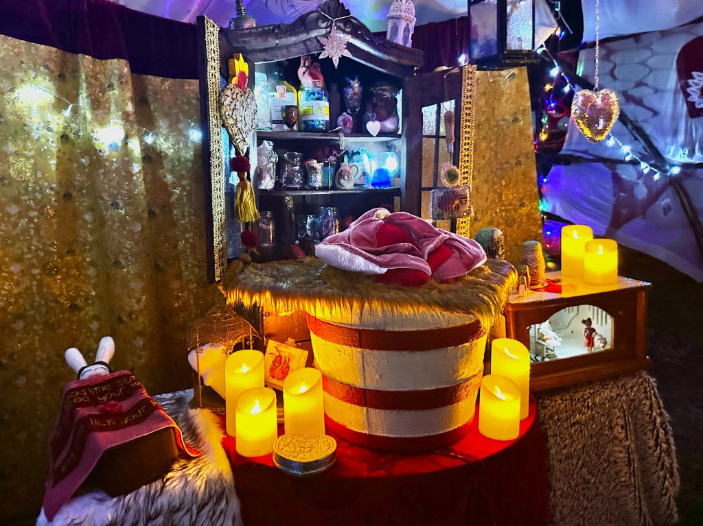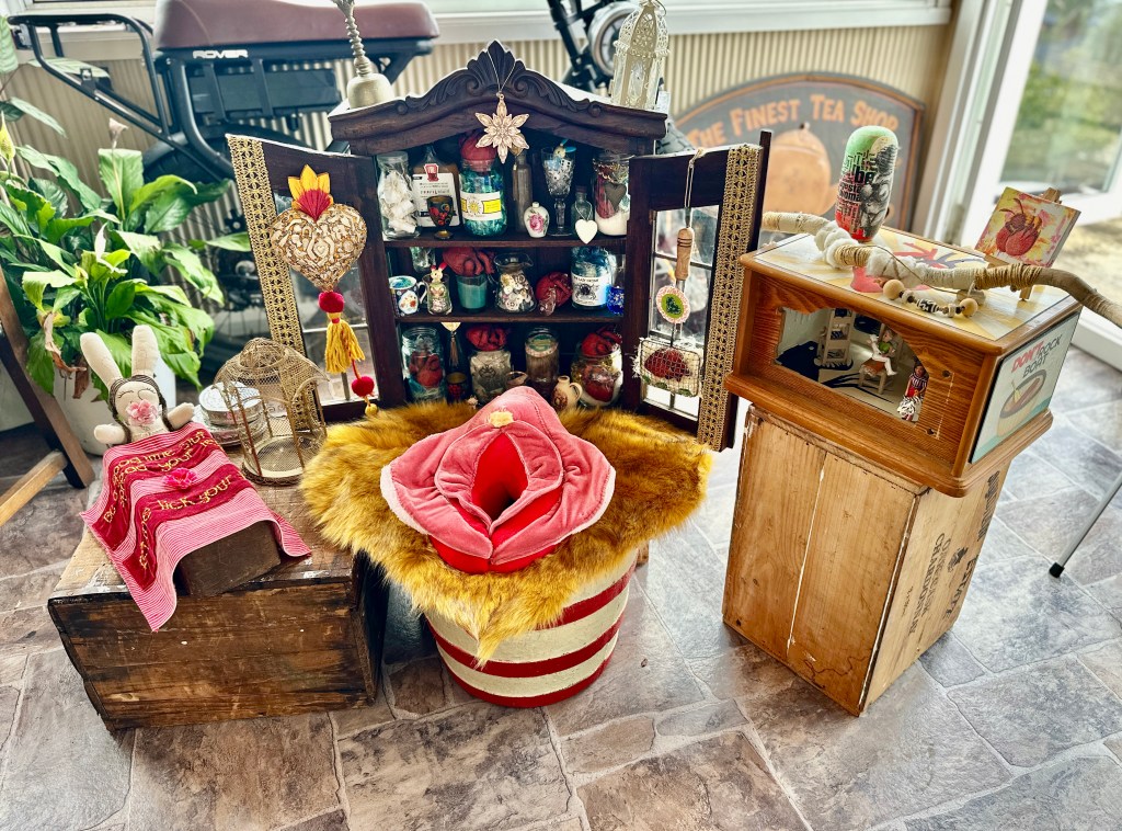 Mixed media installation art, made from found / recycled materials, 3D printed objects, hand-painted lettering, fabrics. The Altar includes some of my other artworks, such as fabric banners from the Enchanted Forest of Love, Baby Girl, Cabinet of Hearts, Effigy and Radio Box.